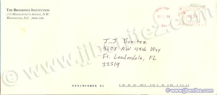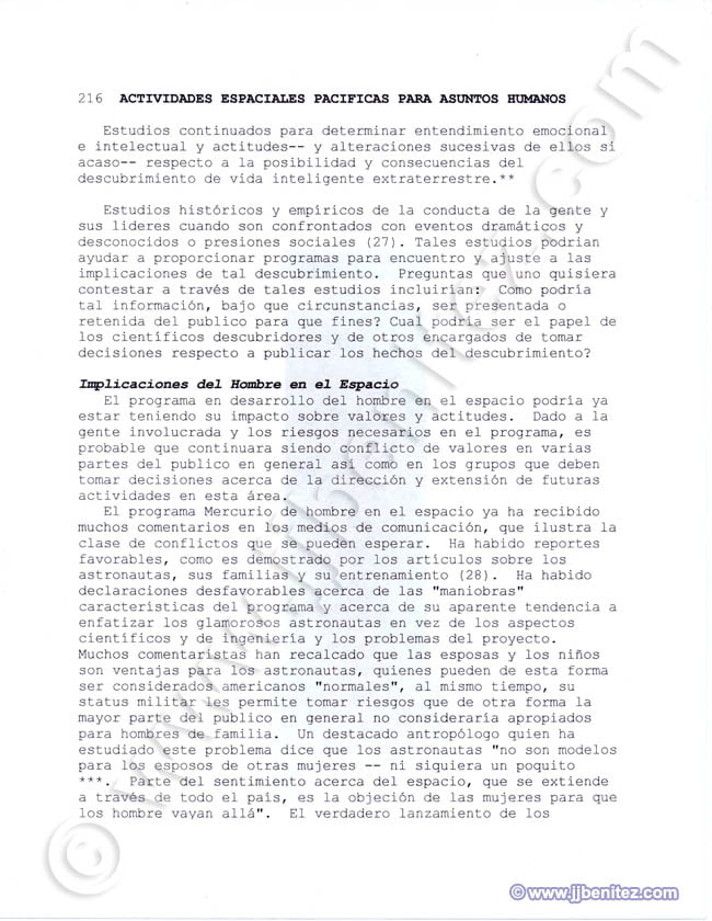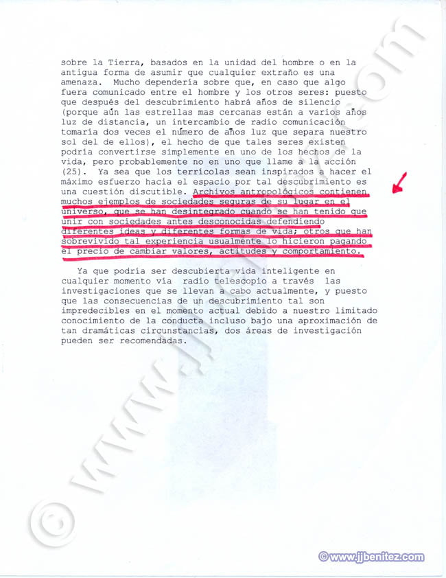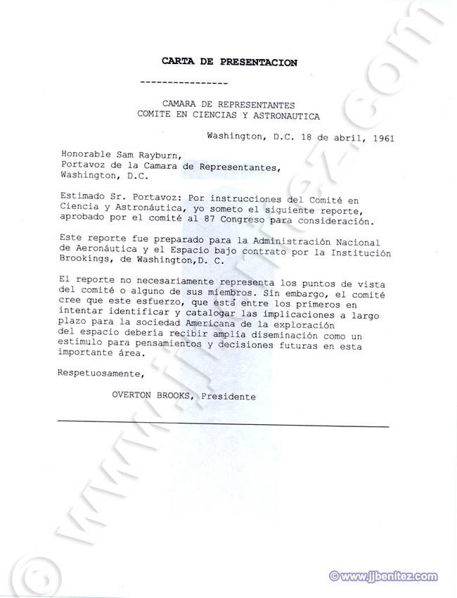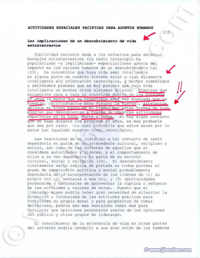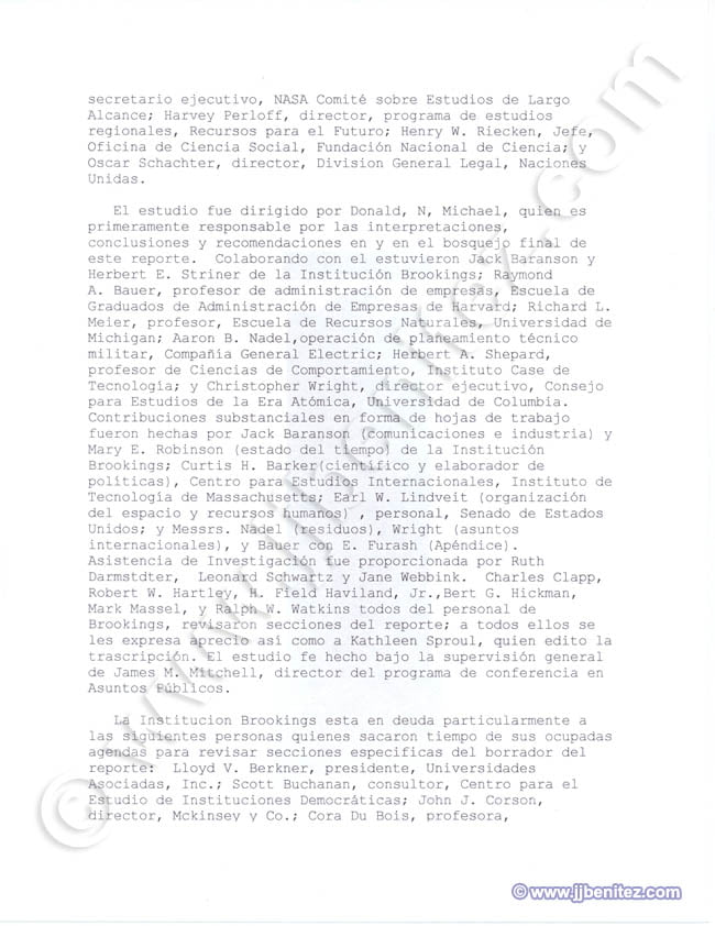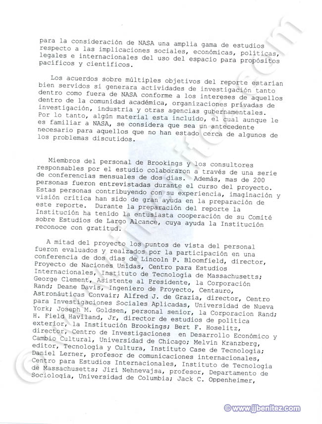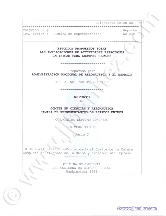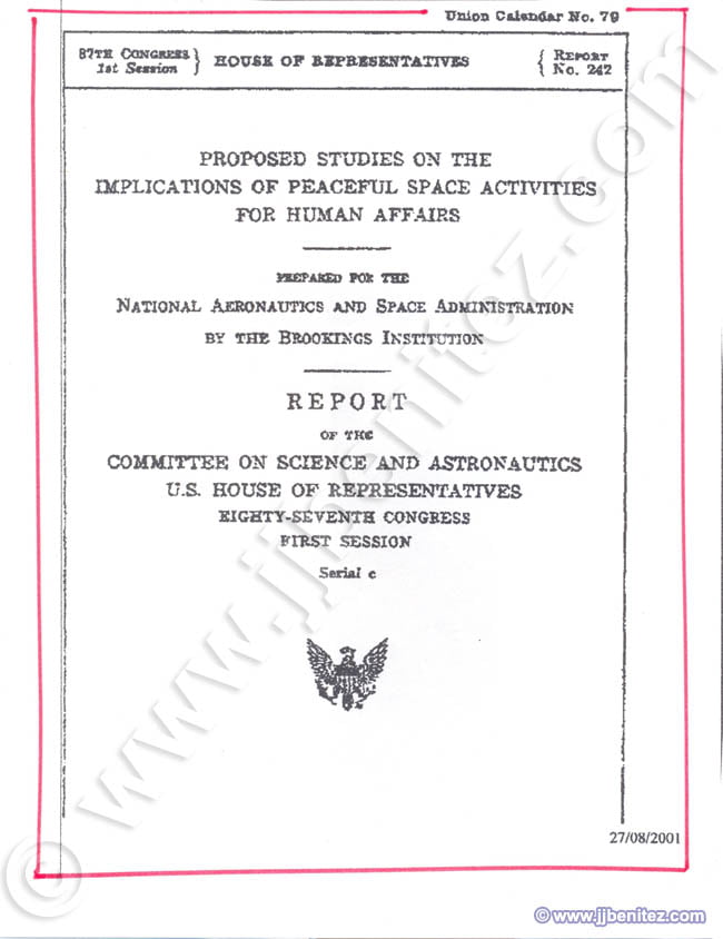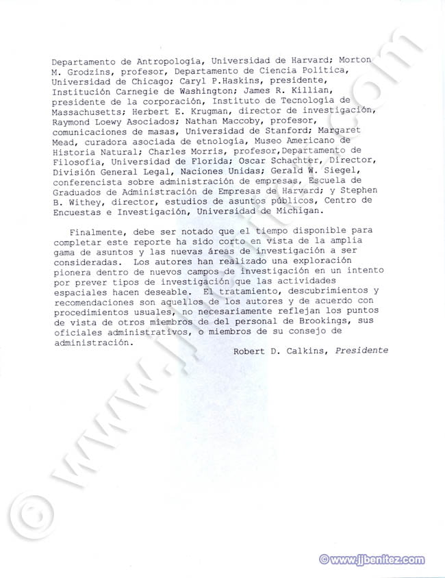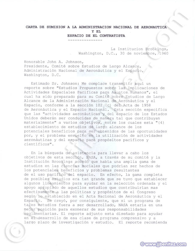 ● 30 de noviembre: la Institución Brookings, con sede en Washington D.C., inicia los trabajos de evaluación, que son concluidos el 18 de abril de 1961. NASA presiona hábilmente y consigue que la prestigiosa Institución Brookings se incline, sutilmente, hacia el “no”: “…las reacciones de la humanidad (ante una posible realidad extraterrestre) son impredecibles… los individuos cambiarían para siempre y sus valores sociales serían socavados”. Uno de los párrafos, en la página 215 del informe, es altamente revelador sobre las presiones de los militares: “Mientras que encuentros cara a cara no ocurrirán dentro de los próximos 20 años (1961-1981) (a menos que su tecnología esté más avanzada que la nuestra, calificándolos para visitar la Tierra), artefactos dejados en algún punto en el tiempo por estas formas de vida podrían ser descubiertas a través de nuestras actividades espaciales en la Luna, Marte o Venus”