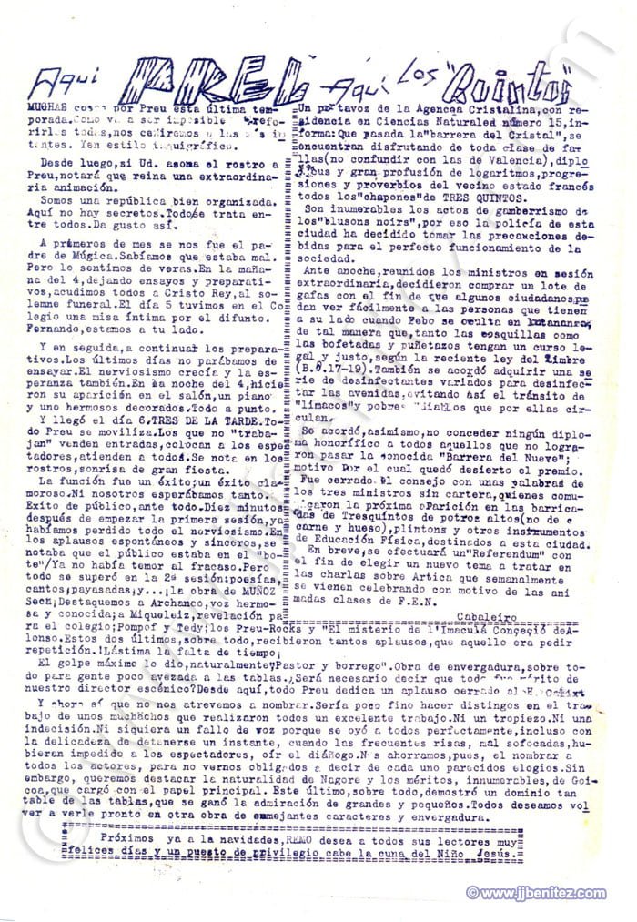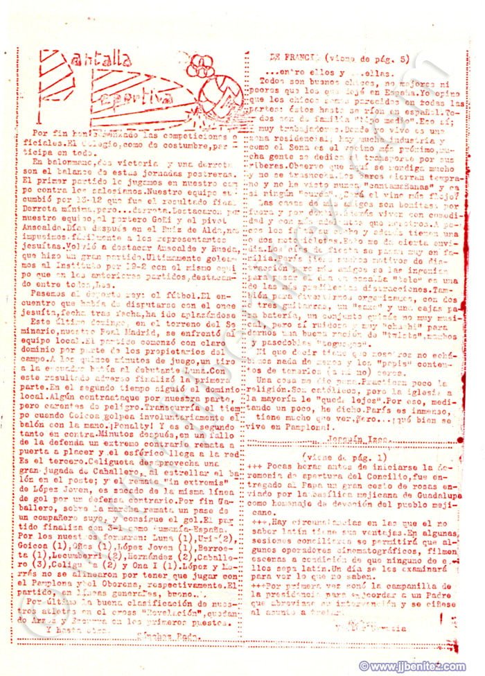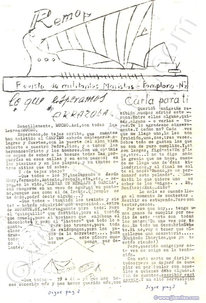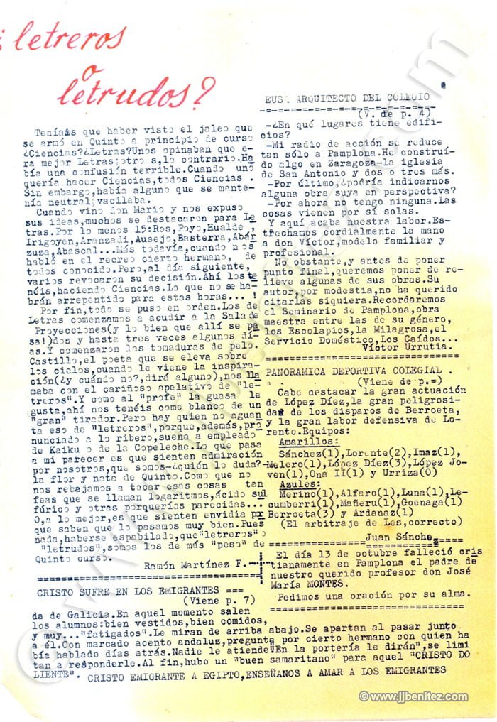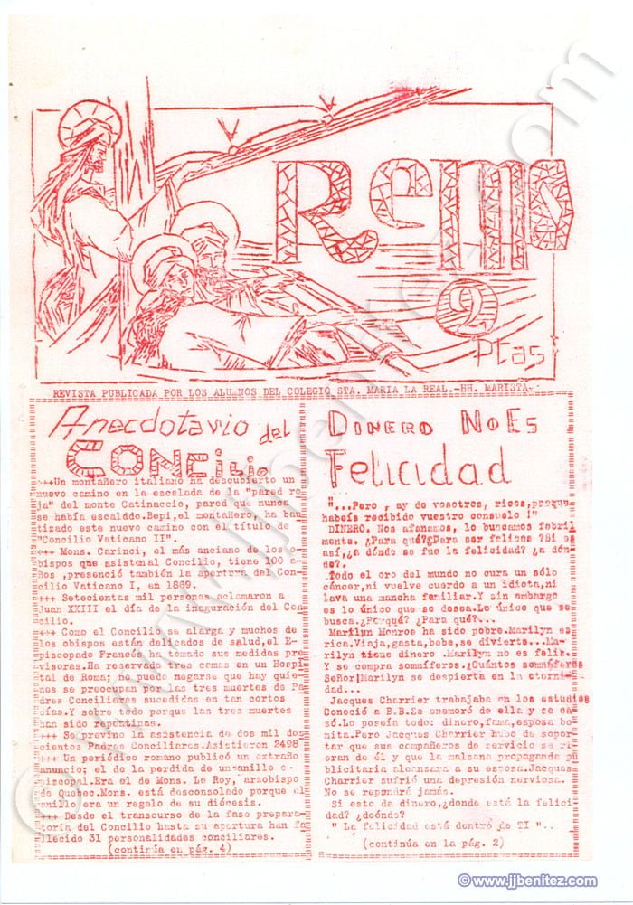 Siento no disponer de fotografías de todos ellos. Éramos veinte o treinta pero, como casi siempre, sólo trabajaban cuatro. Fueron mis primeros compañeros de redacción en un periódico. Oficialmente empecé a trabajar como periodista en “La Verdad” de Murcia (España), pero no es cierto del todo. Mi primer periódico fue “Remo”, un boletín que se editaba en el colegio de los Hermanos Maristas, en Pamplona (España). Corrían los años cincuenta. “Remo”, en ocasiones, era mensual. Otras veces era trimestral. Ocurrió, incluso, que fue censurado. Allí escribían, dibujaban e imprimían o barrían la redacción Pancho, Colodión, Muruzabal, Joaquín Soto, Victor Urrutia, Serafín Carro, Pascal, Manolo Igarreta, Aurelio, Joaquín Ibarra, Paulino Irujo, Patxi Loidi, José Luís López y Joaquín Izco, entre otros. Éramos románticos, idealistas y católicos, apostólicos y romanos. Más o menos como ahora….